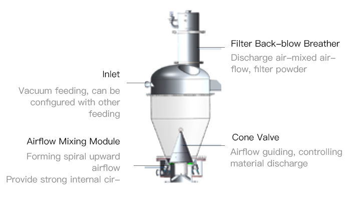 High-pressure, high-speed airflow is emitted from the nozzle, expanding and decompressing as the compressed gas rises. The central powder is continuously “l(fā)ifted” by the thrust of the flow rate and the “l(fā)ifting force” generated by gas expansion, then falls to the bottom along the wall due to gravity and air pressure difference. The airflow “l(fā)ifts” the powder again, creating a rapid circulation mixing process. High-speed airflow also induces relative motion between powders, enhancing the mixing effect.