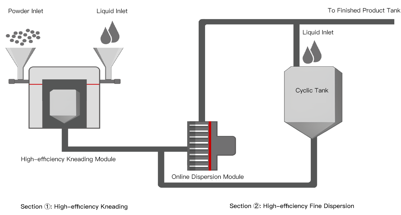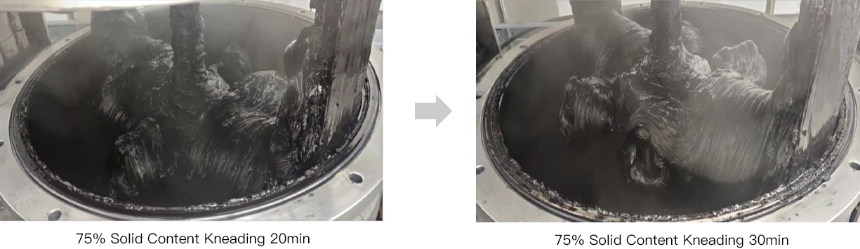 The high-speed rotor generates the primary kneading force, while the low-speed paddle with an opposite rotation direction interacts to keep materials continuously working in the high-speed kneading zone. Kneading time is reduced to just 1/4-1/3 of that required by traditional mixers. The opposite rotation shearing mechanism also greatly enhances dilution efficiency compared with mixers.