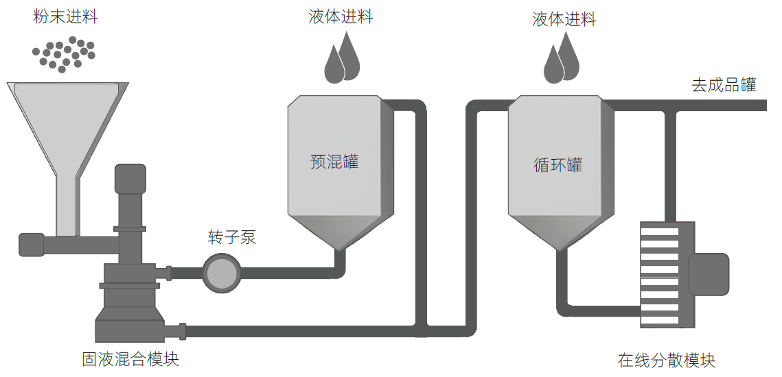 循環(huán)式高效制漿系統(tǒng)(Vorlenmix)的核心是將粉末/液體預(yù)混合和精細(xì)分散集成在一臺(tái)機(jī)器中,能夠快速地完成高質(zhì)量電池漿料的制備。在該系統(tǒng)中,粉末團(tuán)聚體首先被打散頭打散成煙霧狀。在由文丘里效應(yīng)而產(chǎn)生的真空加持下,粉末被離心產(chǎn)生的環(huán)狀“液簾”快速潤(rùn)濕而完成預(yù)混合。預(yù)混合后的漿料從轉(zhuǎn)子和定子之間的狹窄間隙中穿過(guò),以獲得高剪切速率下的分散。得益于高流量的循環(huán)方式,整批物料在很短時(shí)間內(nèi)就能完成多次分散,以獲得成品漿料。